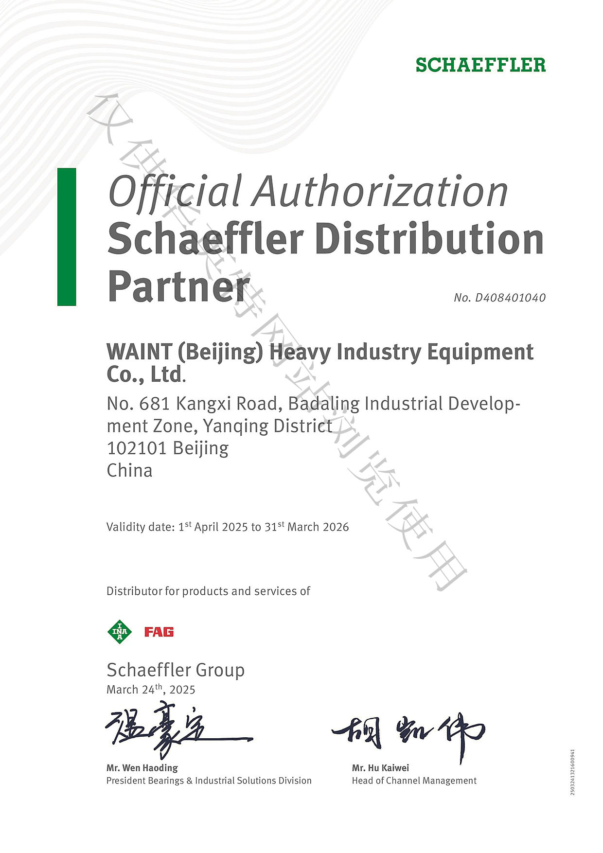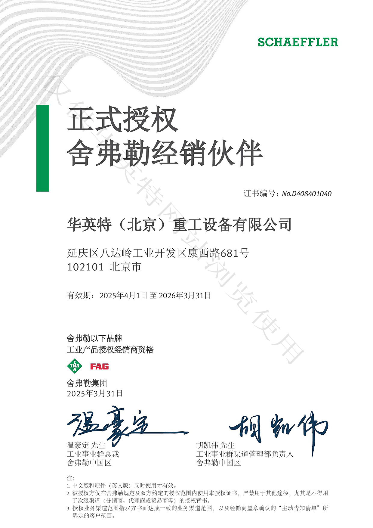 舍弗勒2025年授权证书(中文)
